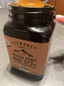 以前扁桃炎で入院してから、喉にはかなり気をつけて生活していますが、ちょっとでも違和感が出てきたらマヌカハニーをティースプーン1さじ食べています。マヌカハニーには殺菌・消毒の効果があり、ラベルのMGO数値が高いほど効果が高いと言われています。