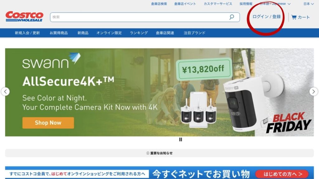 ①コストコのHPにアクセスし、ログイン/登録をクリックします。