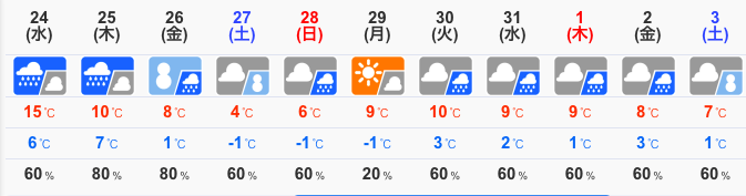 今のところ、上越市は金曜日にまとまった雪が降る予報みたいです。