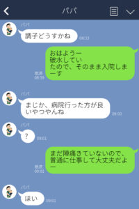入院しても破水をしているので、先生に売店に行く許可は頂いているものの、看護師さんには行かないで下さいと言われているのでトイレくらいしか行けず。暇なのでパパとLINEのやり取りをしていました。